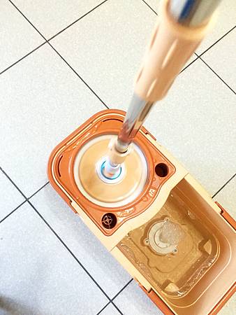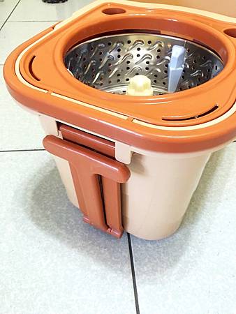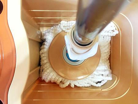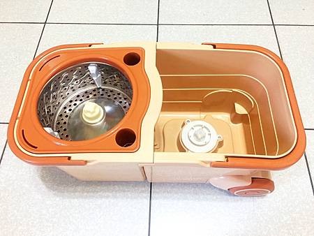 左邊則是採用不銹鋼的脫水槽,高速脫水-一樣單手下壓拖把,不鏽鋼脫水轉盤利用離心力將多餘水分甩出。