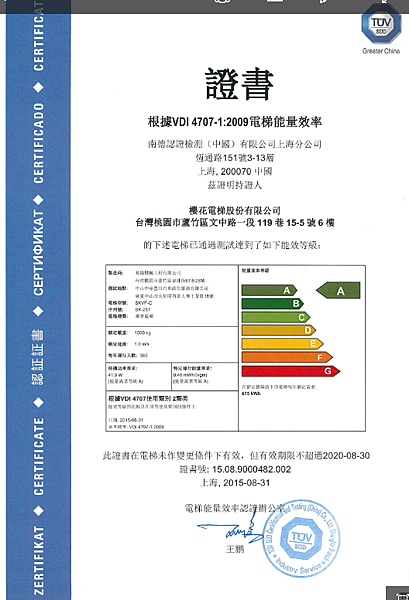 在能源日益匱乏昂貴的時代,櫻花電梯領先同業,榮獲德國節能認證機構(TUV),A級節能認證