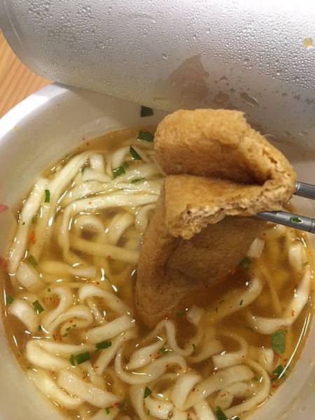 熱水泡開後豆皮裡面吸了滿滿的湯汁(要小心燙到),就和現做的日式烏龍麵裡的豆皮口感,麵條也是有Q度的,以泡麵來說已經是滿分,非常好吃呀!