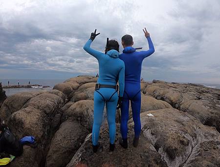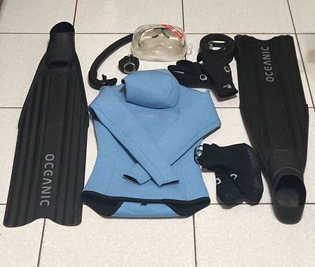 一雙不合腳的蛙鞋、一套不合身的防寒衣、一個不貼臉的面鏡
