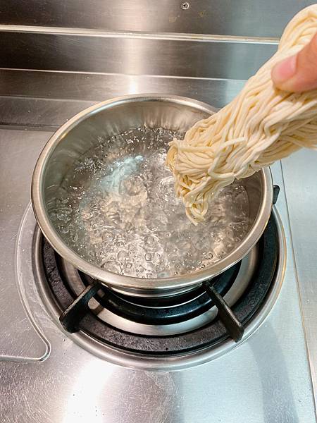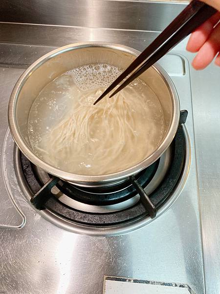 接著等水沸騰後煮個三分鐘,就可以將麵瀝乾放入碗中!