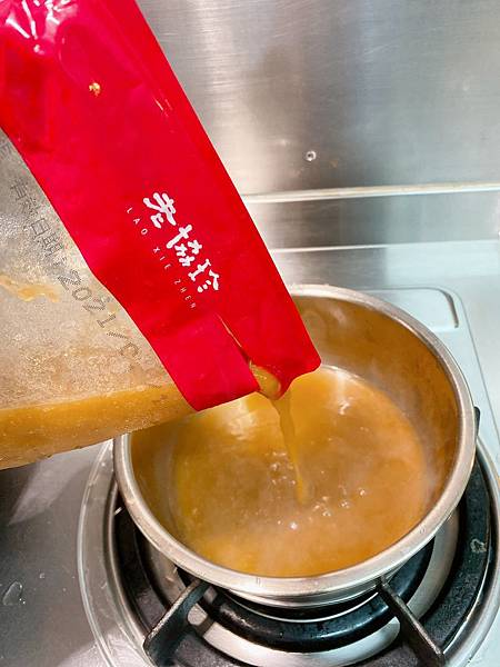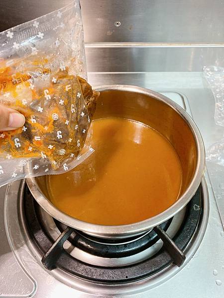 將川味牛肉、牛肉湯倒入鍋中以小火慢慢加熱至沸騰